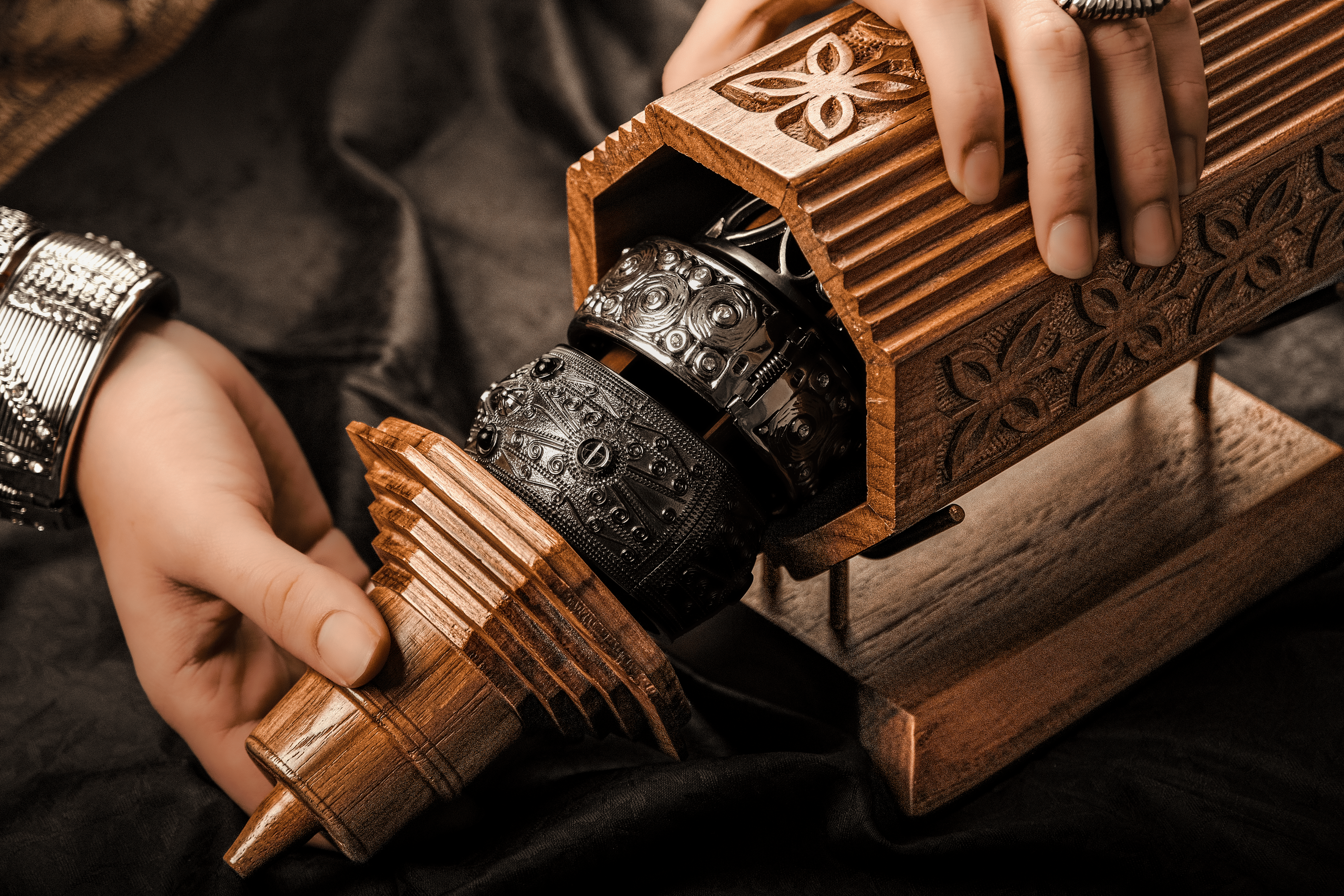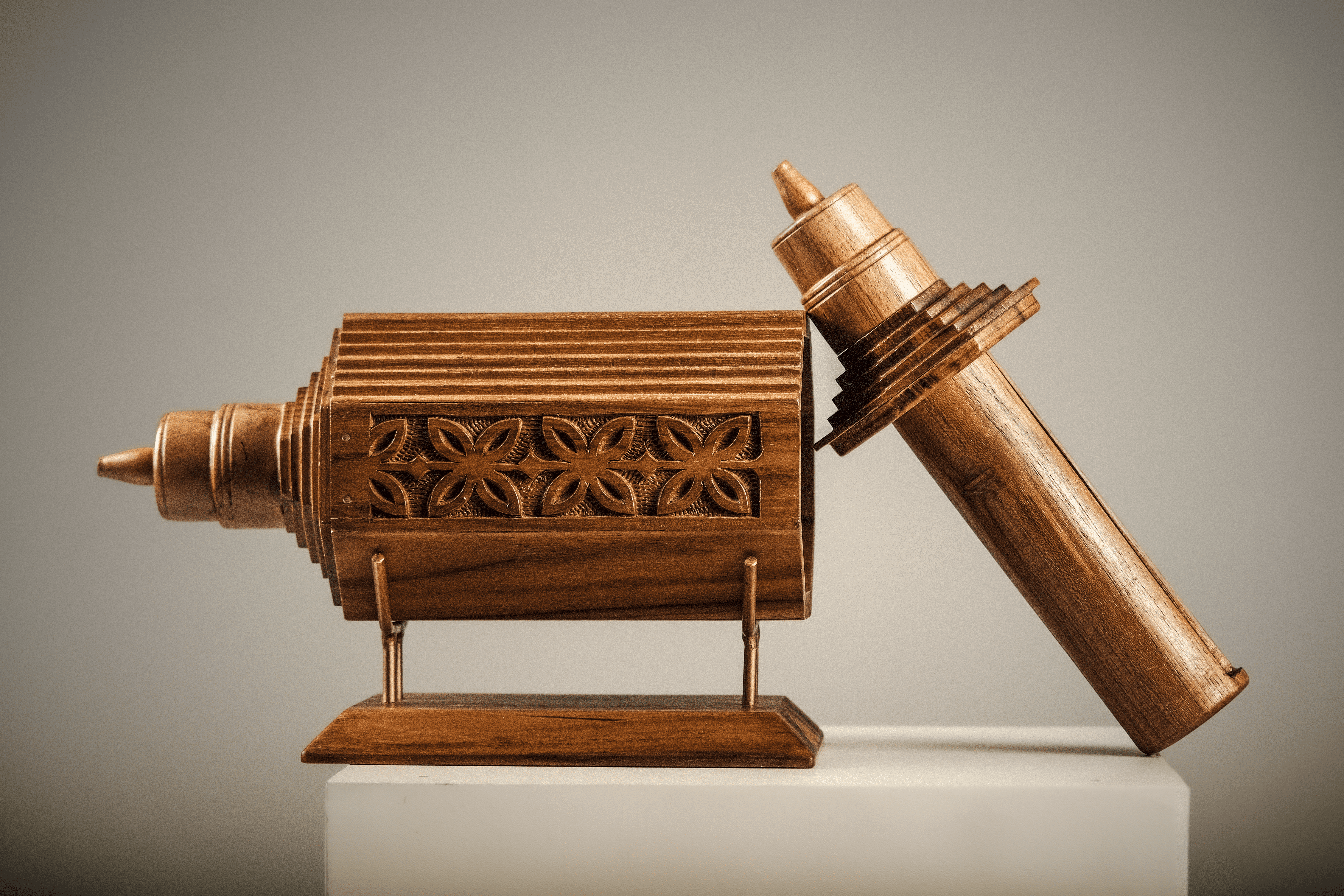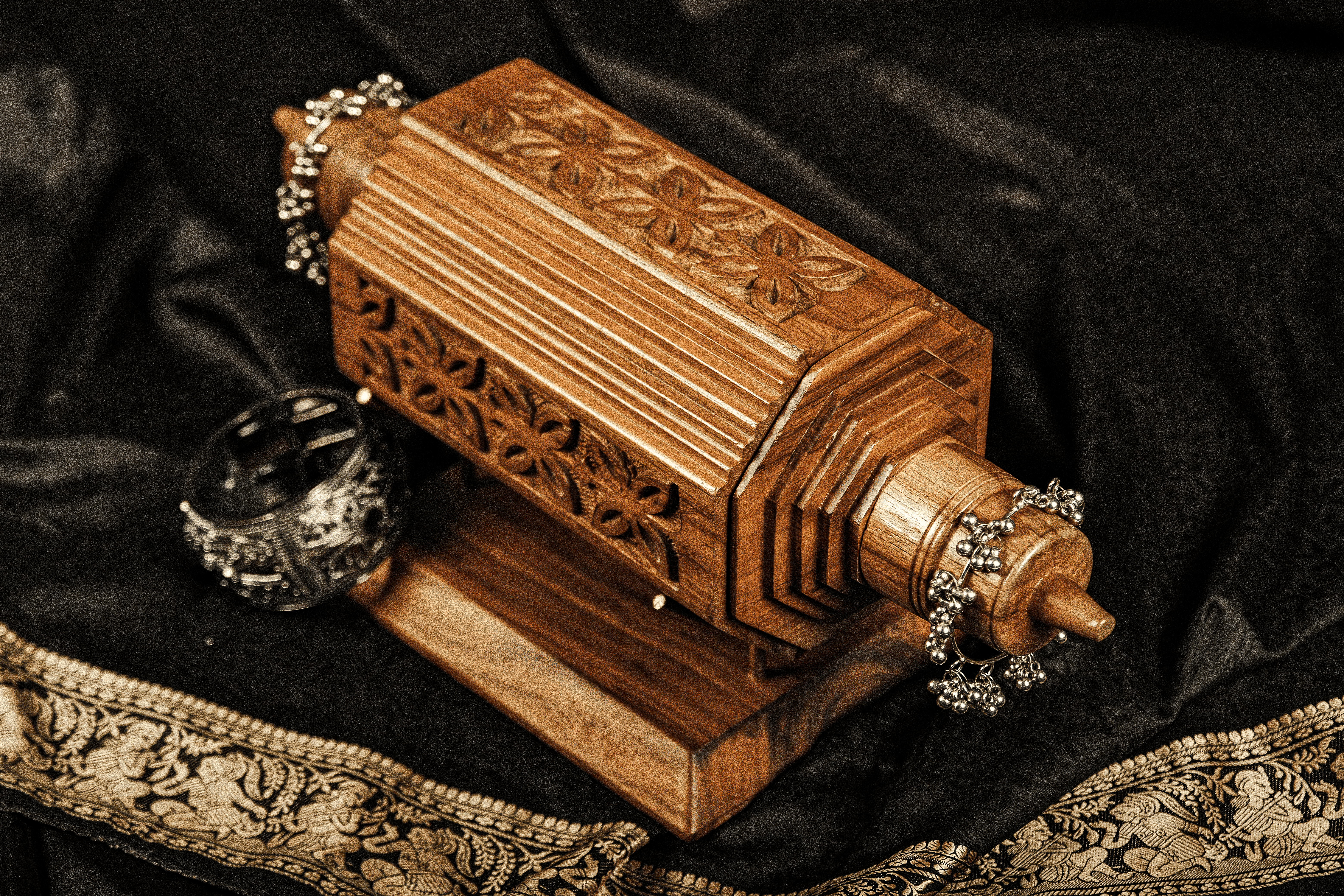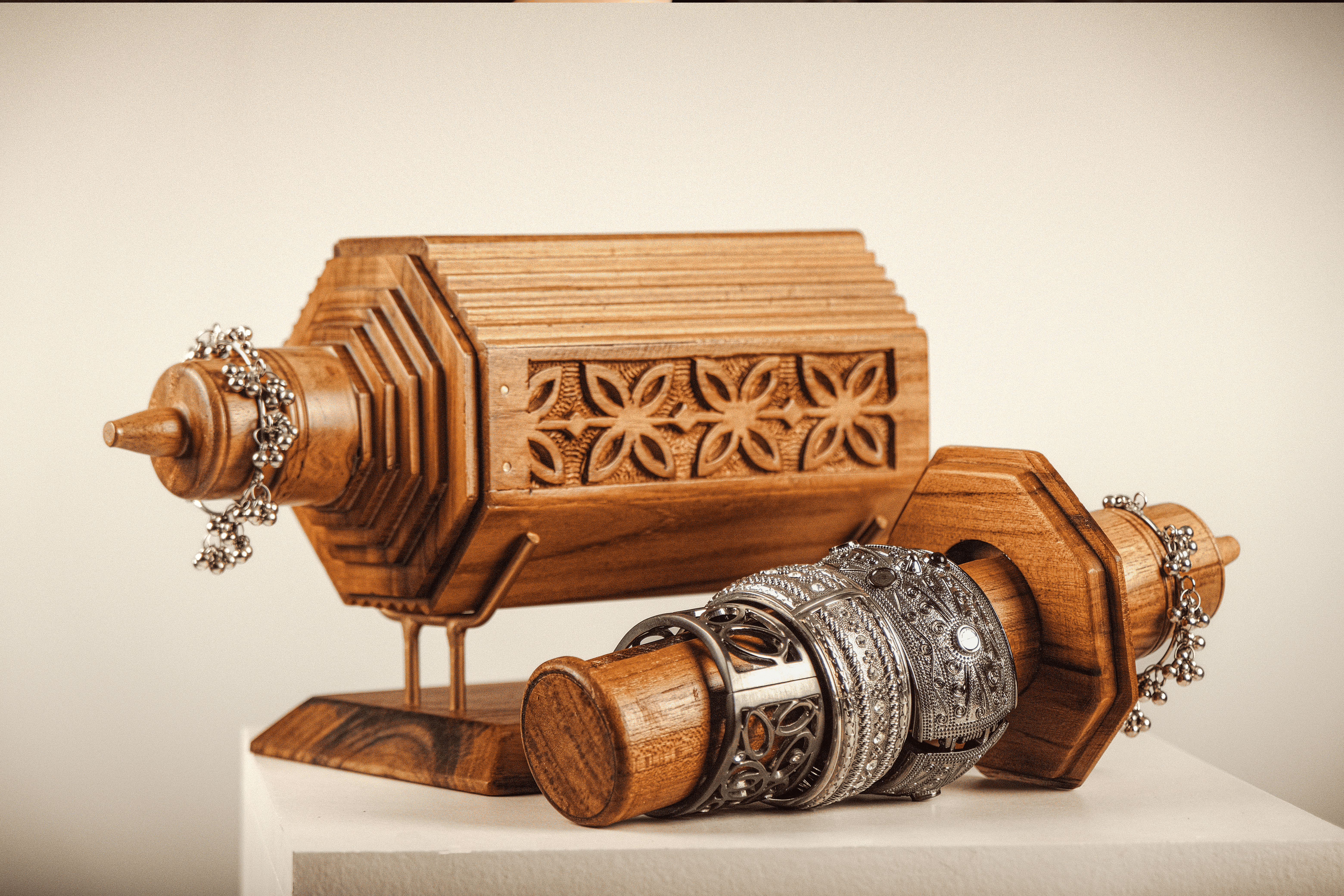 "Crafted from teakwood and brass, this jewellery box draws from Burmese stupa architecture and zardosi artistry, merging cultural heritage with timeless craftsmanship"