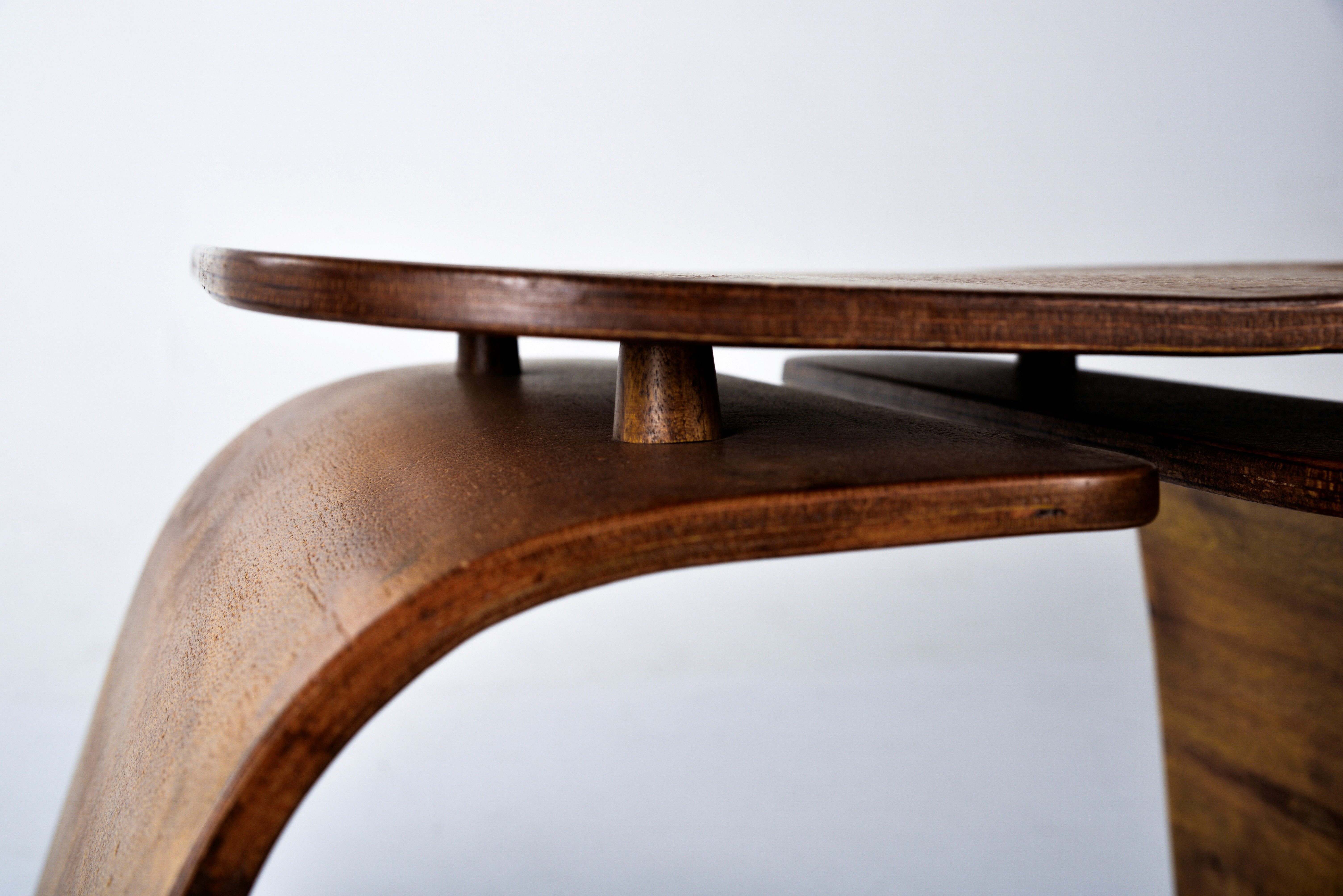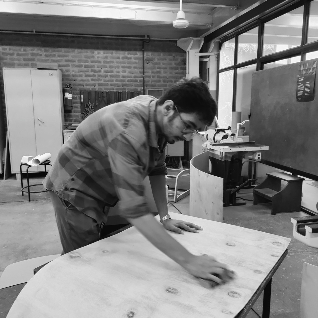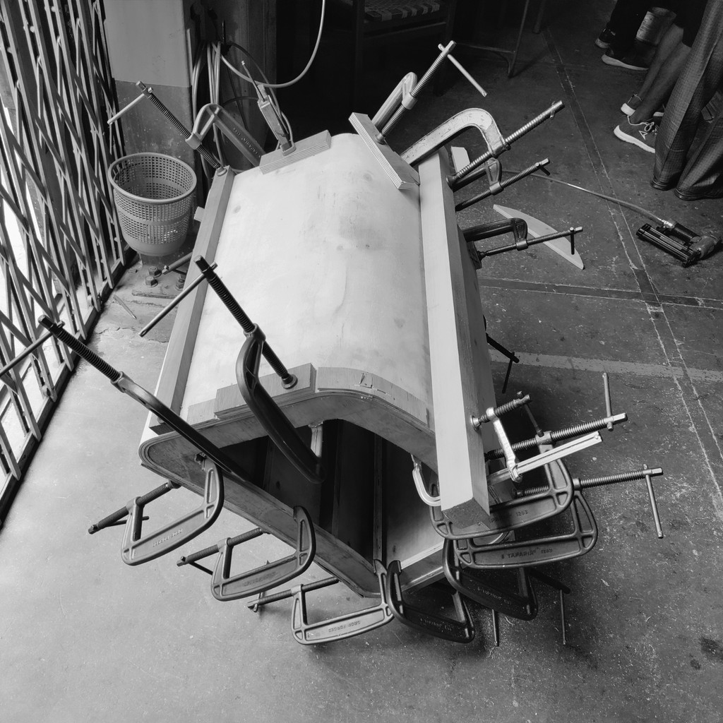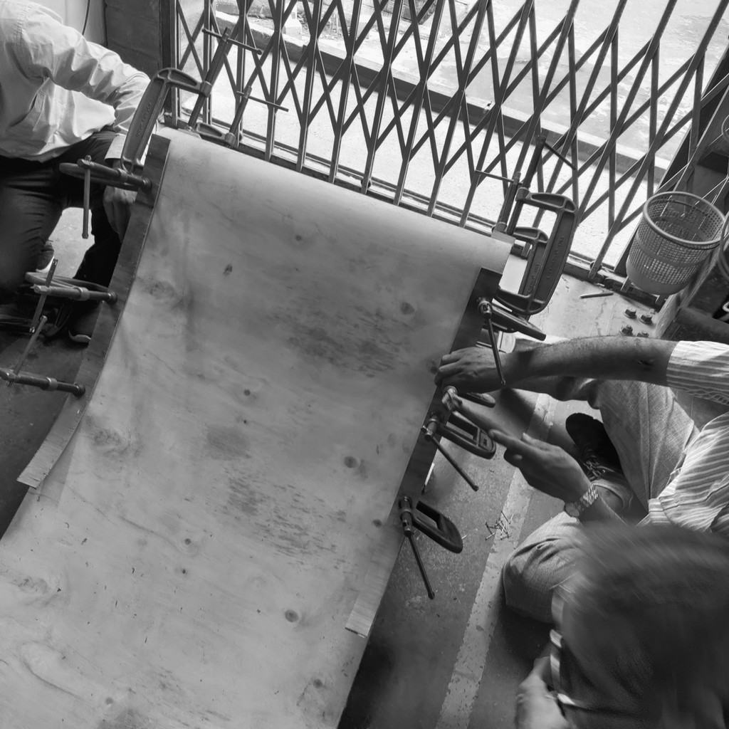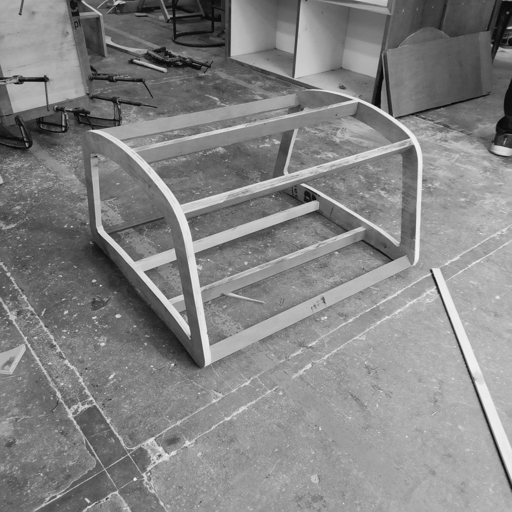 I began the prototype by making a plywood jig/frame. The 5mm bend-ply was sanded smooth, then three layers were glued together and pressed onto the frame with clamps and nails. After the glue dried, we removed the piece from the frame a 15mm thick curved form, strong enough to hold over 150 kg.