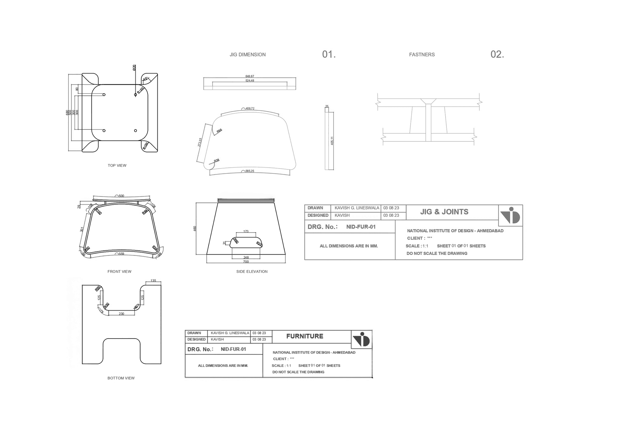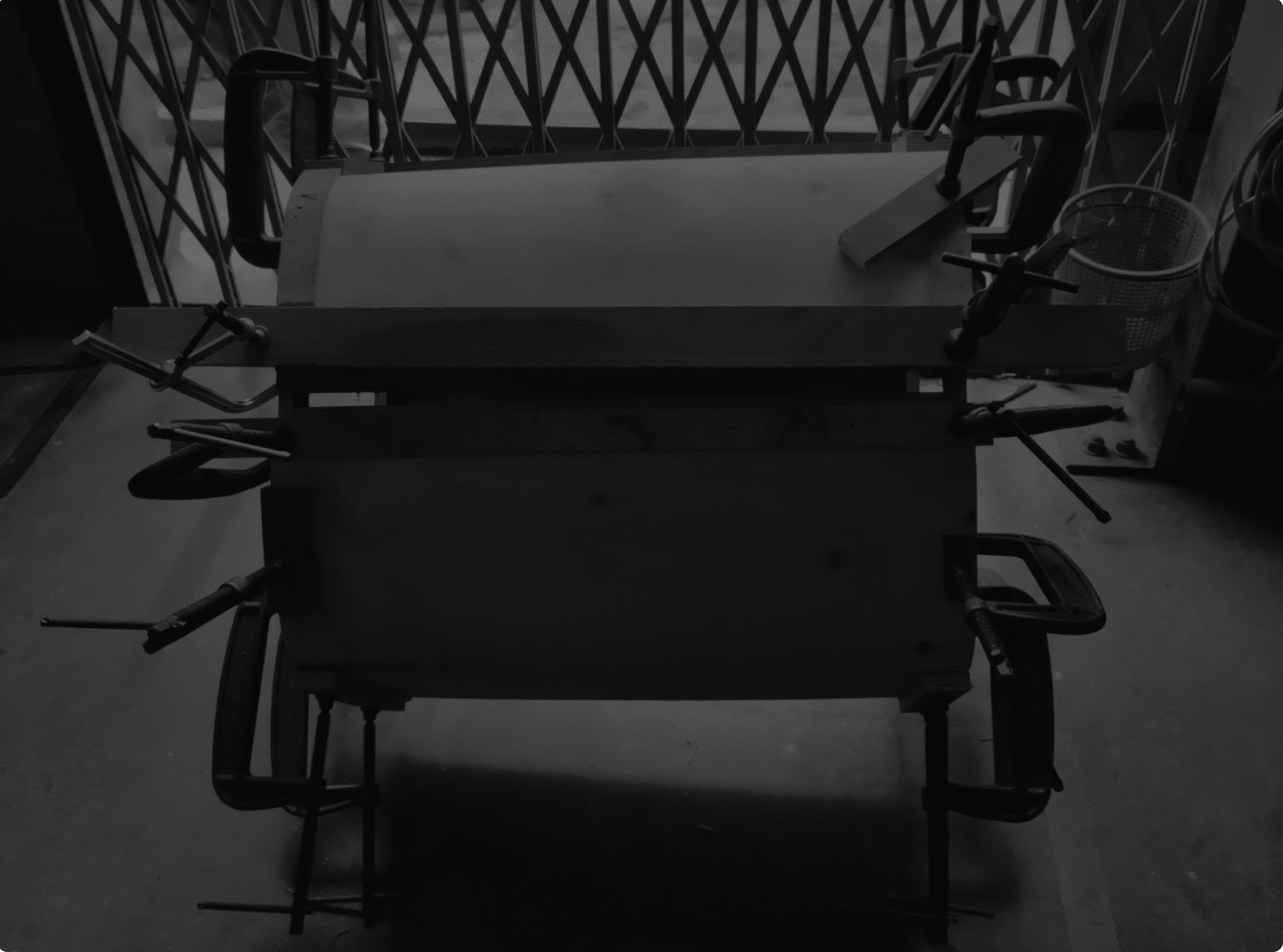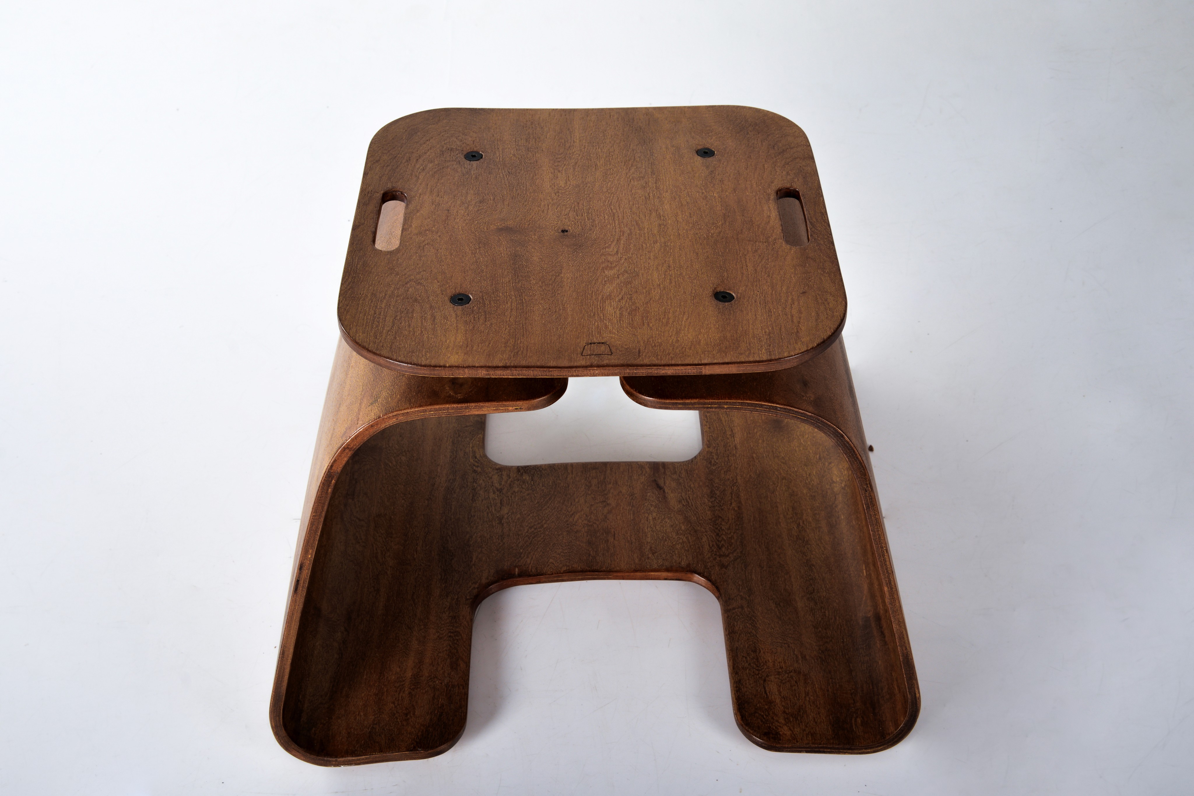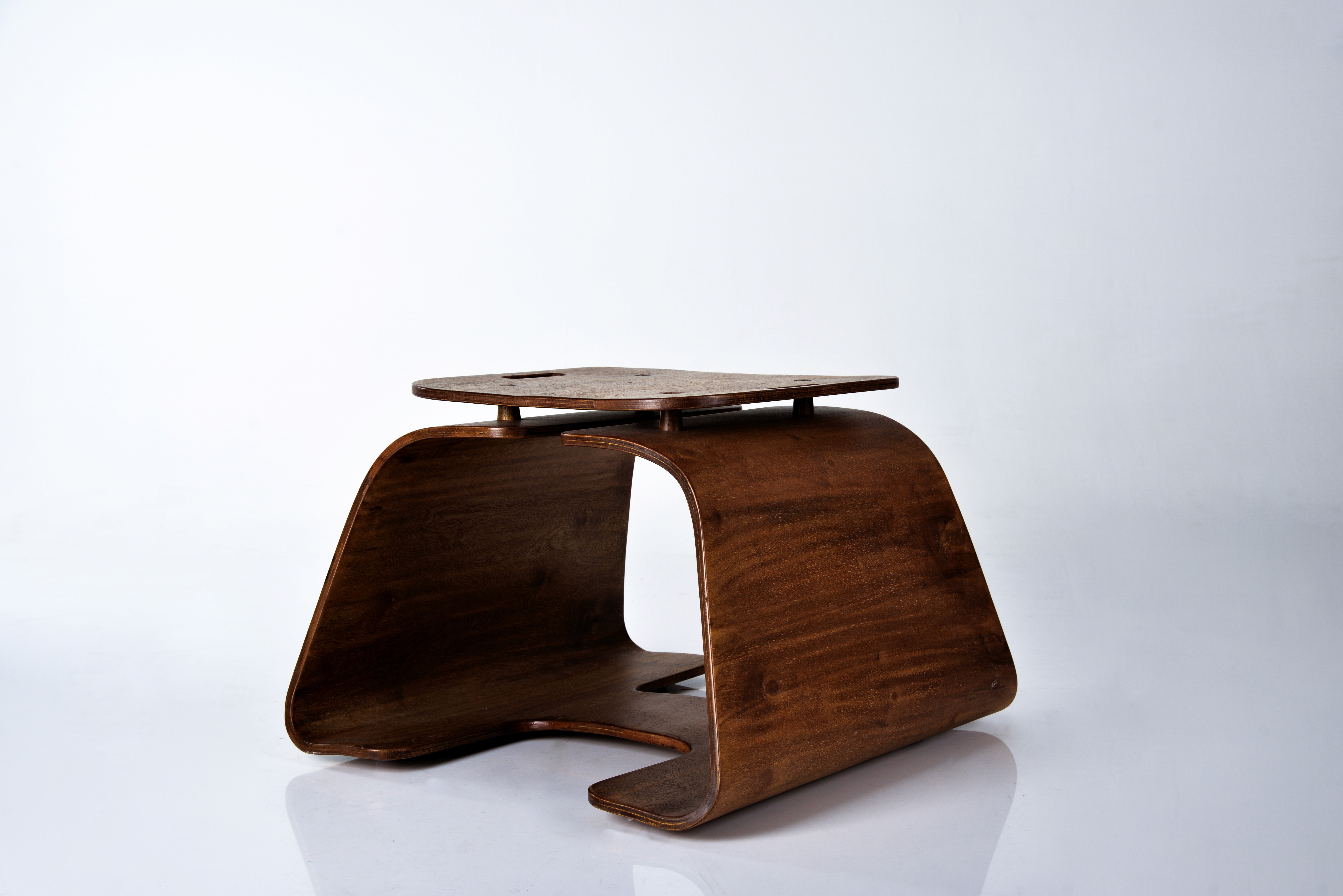 I began the prototype by making a plywood jig/frame. The 5mm bend-ply was sanded smooth, then three layers were glued together and pressed onto the frame with clamps and nails. After the glue dried, we removed the piece from the frame a 15mm thick curved form, strong enough to hold over 150 kg.