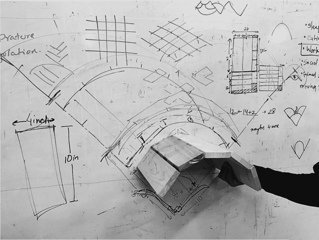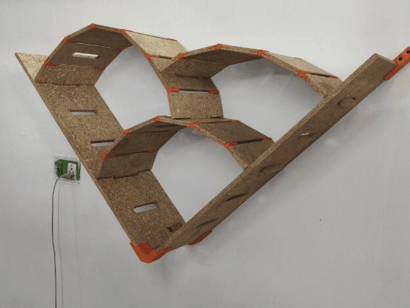 Inspired by fish scales, interlocking Craste board arcs create seamless, load-bearing surfaces that combine structural efficiency with visual and functional versatility.