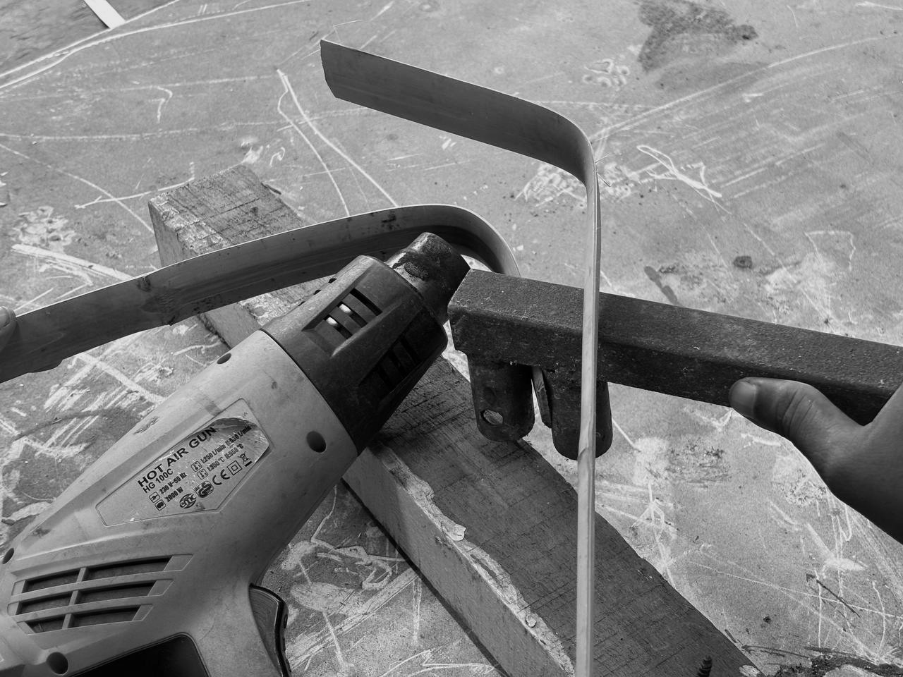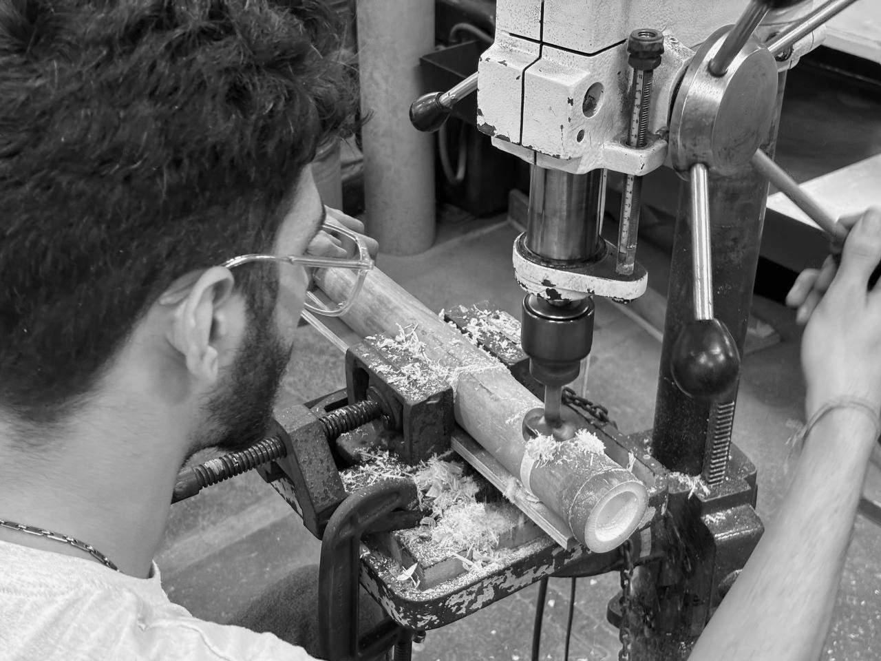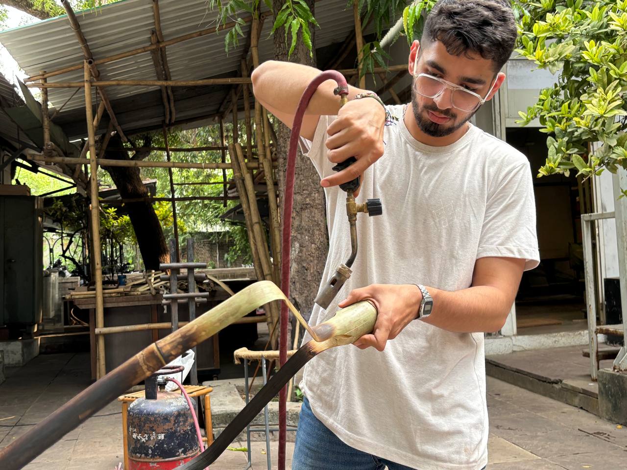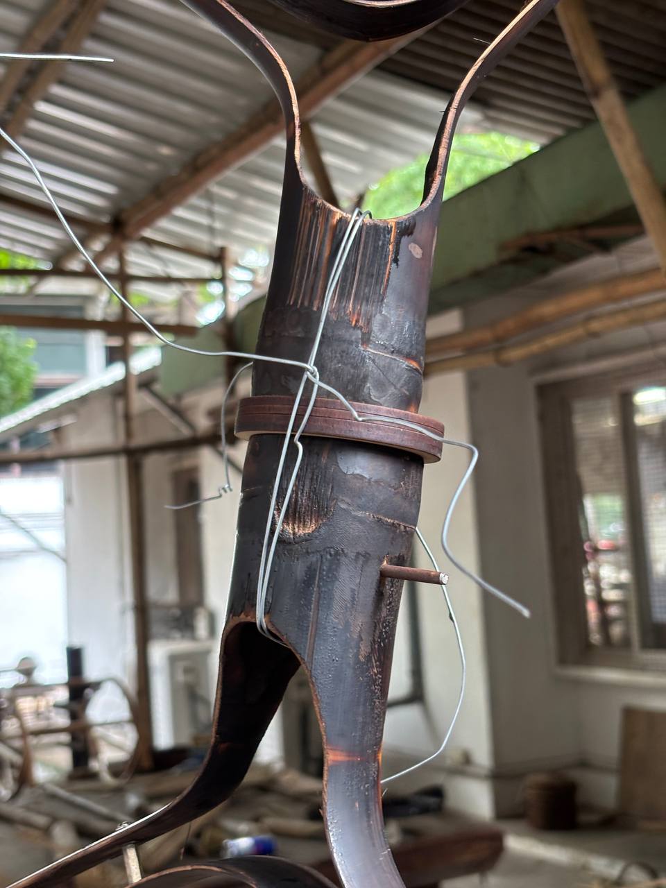 with drilling, cutting, heat bending, slits and slivers. Tested various joineries and studied how light interacts with bamboo to create reflections and diffusion while finding ways to conceal the light source. Also diffuser is made of banana leaf paper.